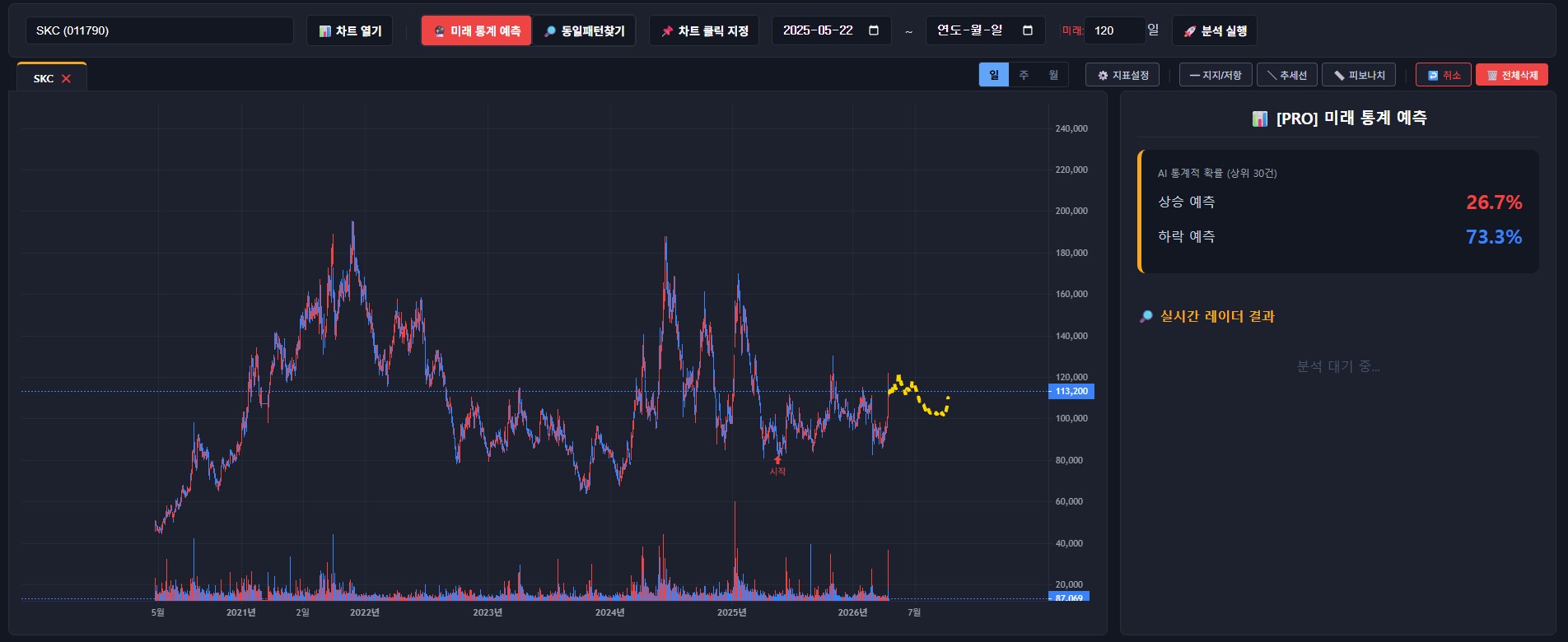 유리기판 관련주들은 현재 거대한 상승 추세 속에서 기술적 검증 소식에 따라 변동성을 키우고 있습니다. [미래 예측 차트 시스템]은 과거 유사한 기술 혁신 구간에서 수급이 이탈했는지, 아니면 개미들을 털어내기 위한 '페이크(Fake) 하락'인지를 데이터로 판별해 줍니다. 예를 들어, 양산 지연 소식에 주가가 빠질 때 이것이 차트상 지지선을 깨는 유의미한 하락인지, 아니면 통계적으로 다시 튀어 오를 확률이 높은 구간인지를 보여주는 방식입니다.